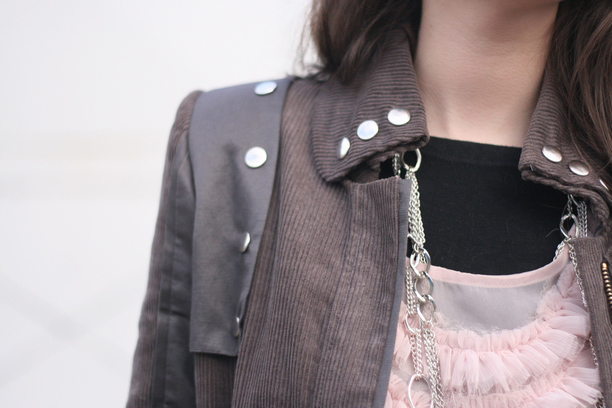 I really like this jacket with cute dress. and the combination of two different materials on jacket look great.