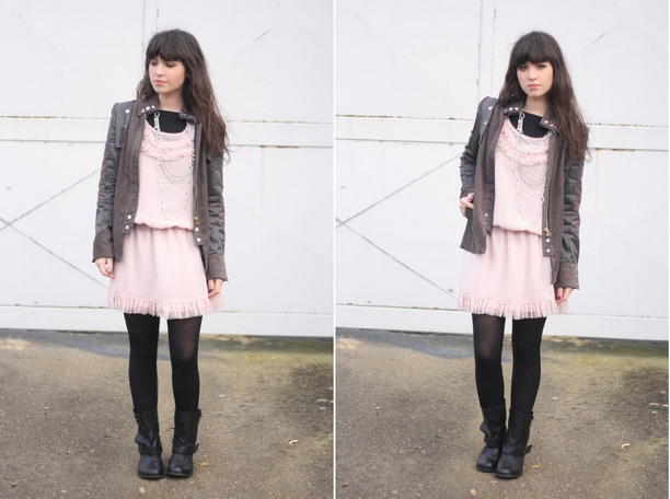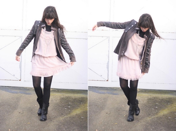 Une robe toute douce robe poudrée avec cette veste et tes bottes motardes, j’adhère, j’adère, j’adhère! (je l’ai assez dit? une p’tite dernière… j’adhère complètement!)